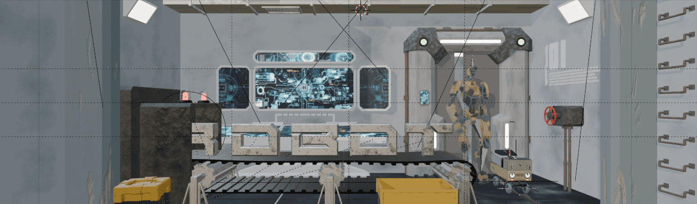 J’ai commencé par des croquis et recherches visuelles pour définir l’univers. Ensuite, j’ai modélisé la scène et les éléments dans Blender (lettres, tapis roulant, salle, écrans), puis animé les séquences principales et secondaires. Les personnages ont été animés via Mixamo, et les effets comme les lumières clignotantes ou les LED ont été intégrés pour renforcer l’ambiance.