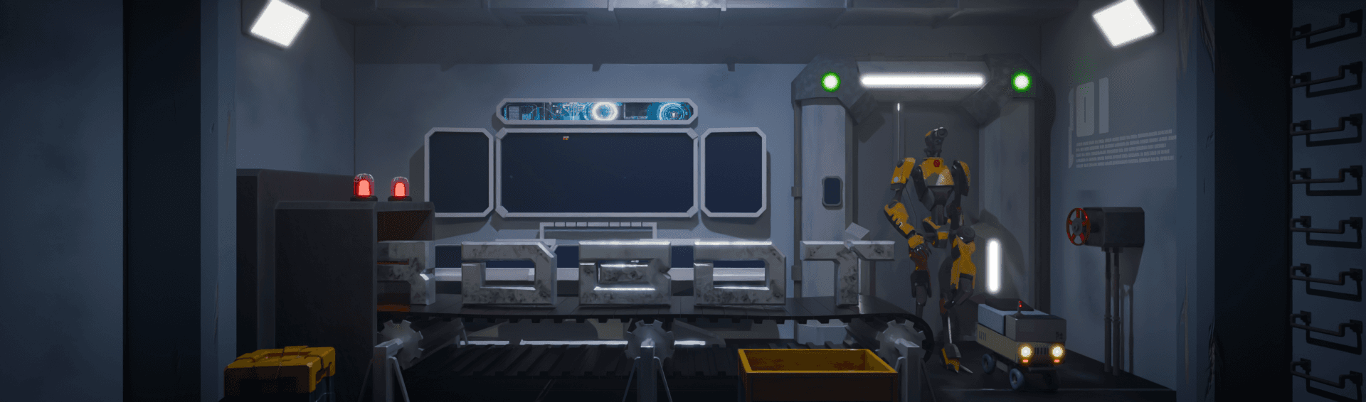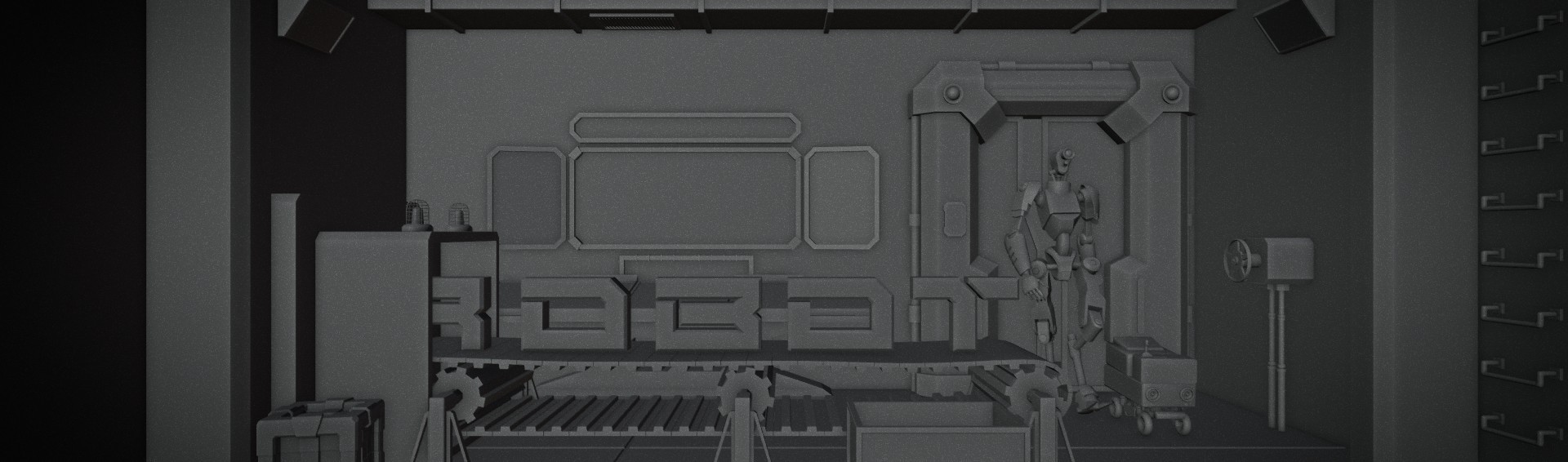 Le mot "ROBOT" est mis en scène dans un univers inspiré des usines et chaînes de production futuristes. Chaque lettre est transportée par un tapis roulant, assemblée progressivement, tandis que deux robots entrent dans une salle de contrôle automatisée. L’idée était de retranscrire un univers sci-fi froid et industriel en s’appuyant sur les codes visuels de la science-fiction.