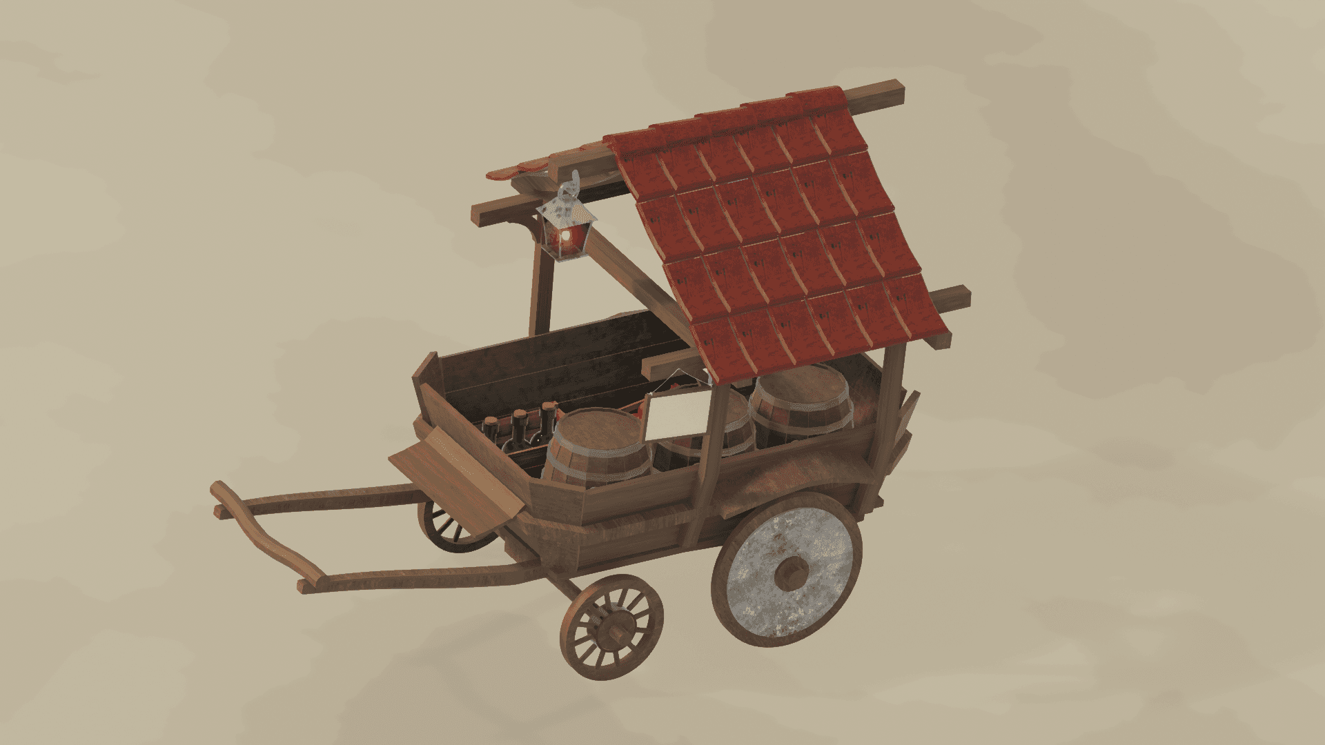 • Charrette : modélisée entièrement à la main, avec roues asymétriques (bois et pierre), lanternes, caisse et barils.